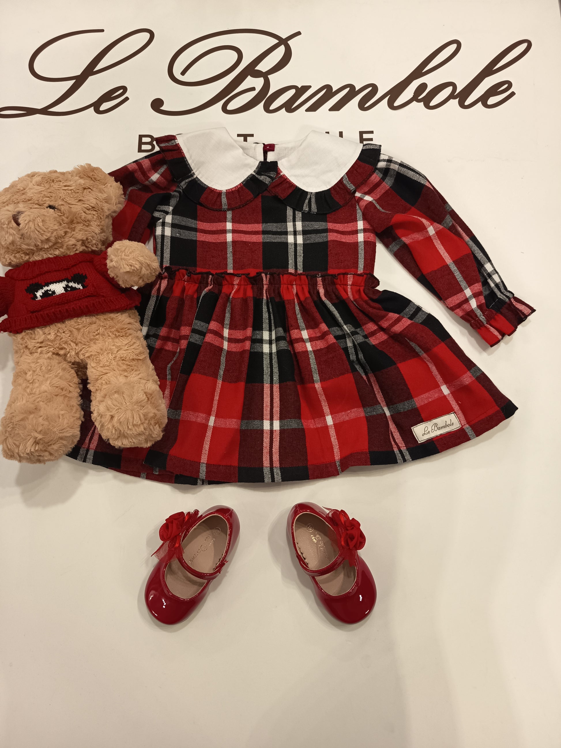 Abito in lana a quadri con collo in cotone con ruches.
