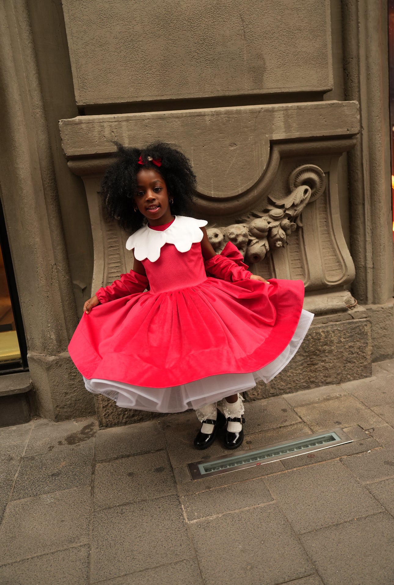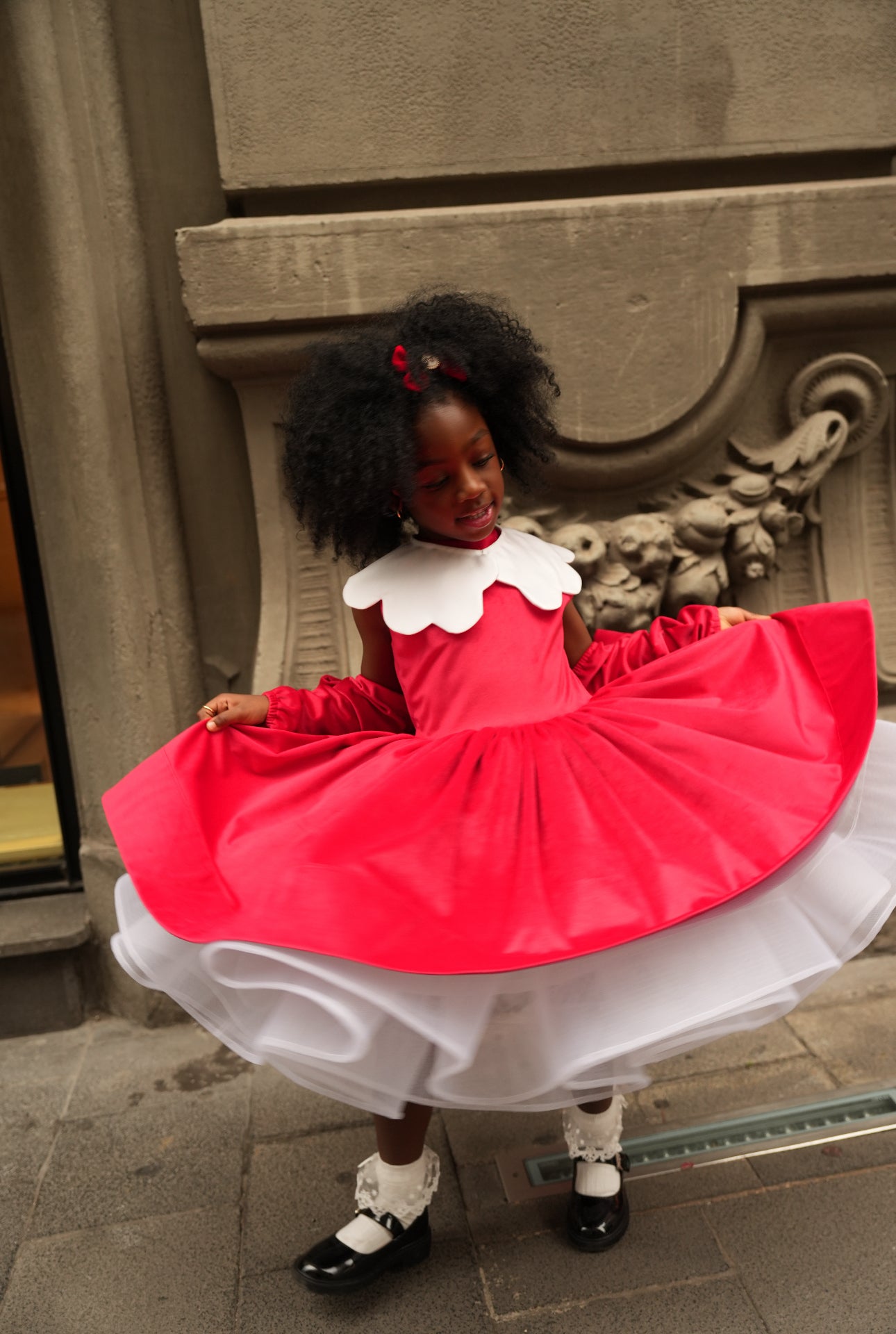 Abito con tulle in velluto con collo fiore e maniche separate con dettaglio fiocco.