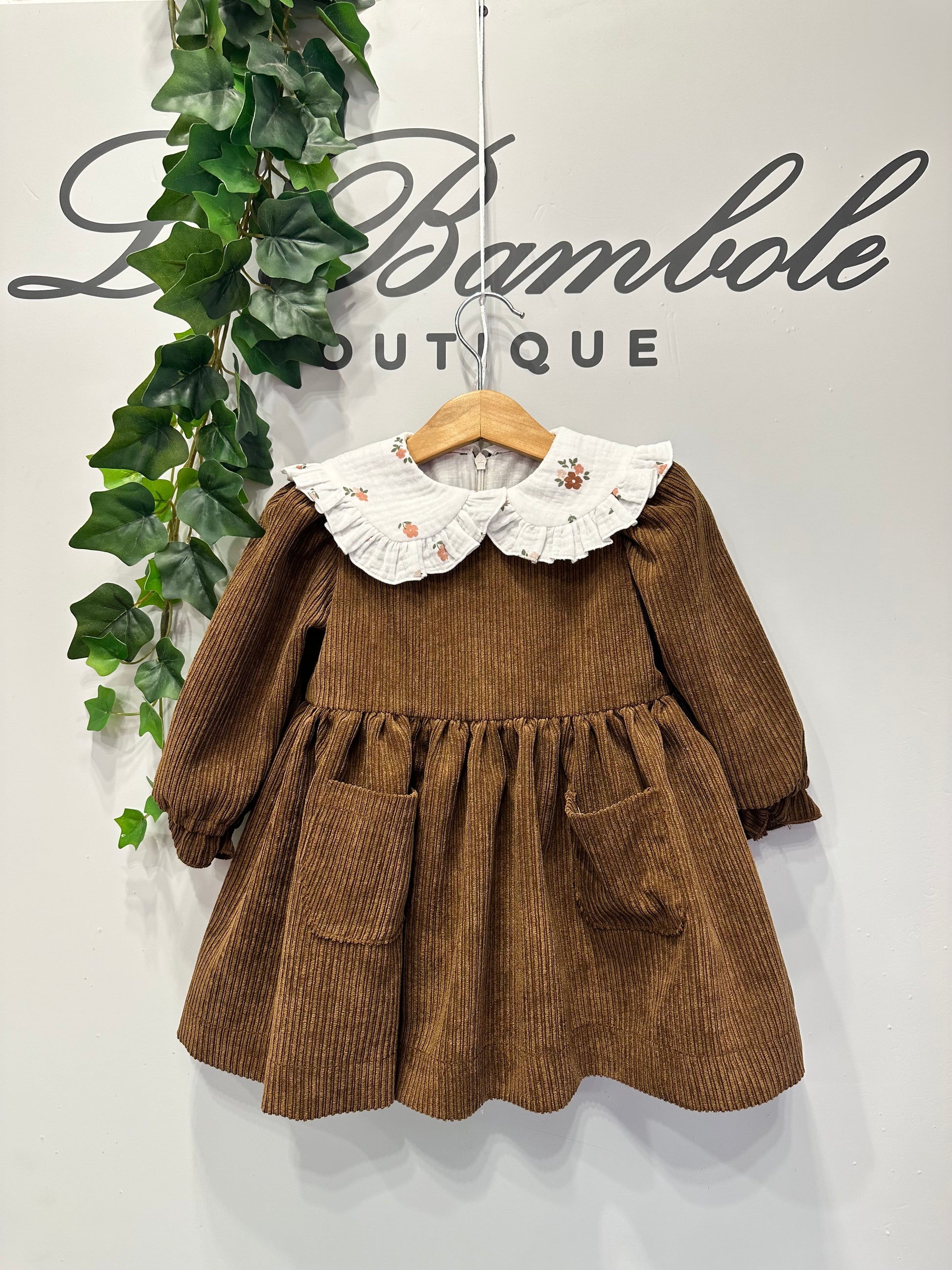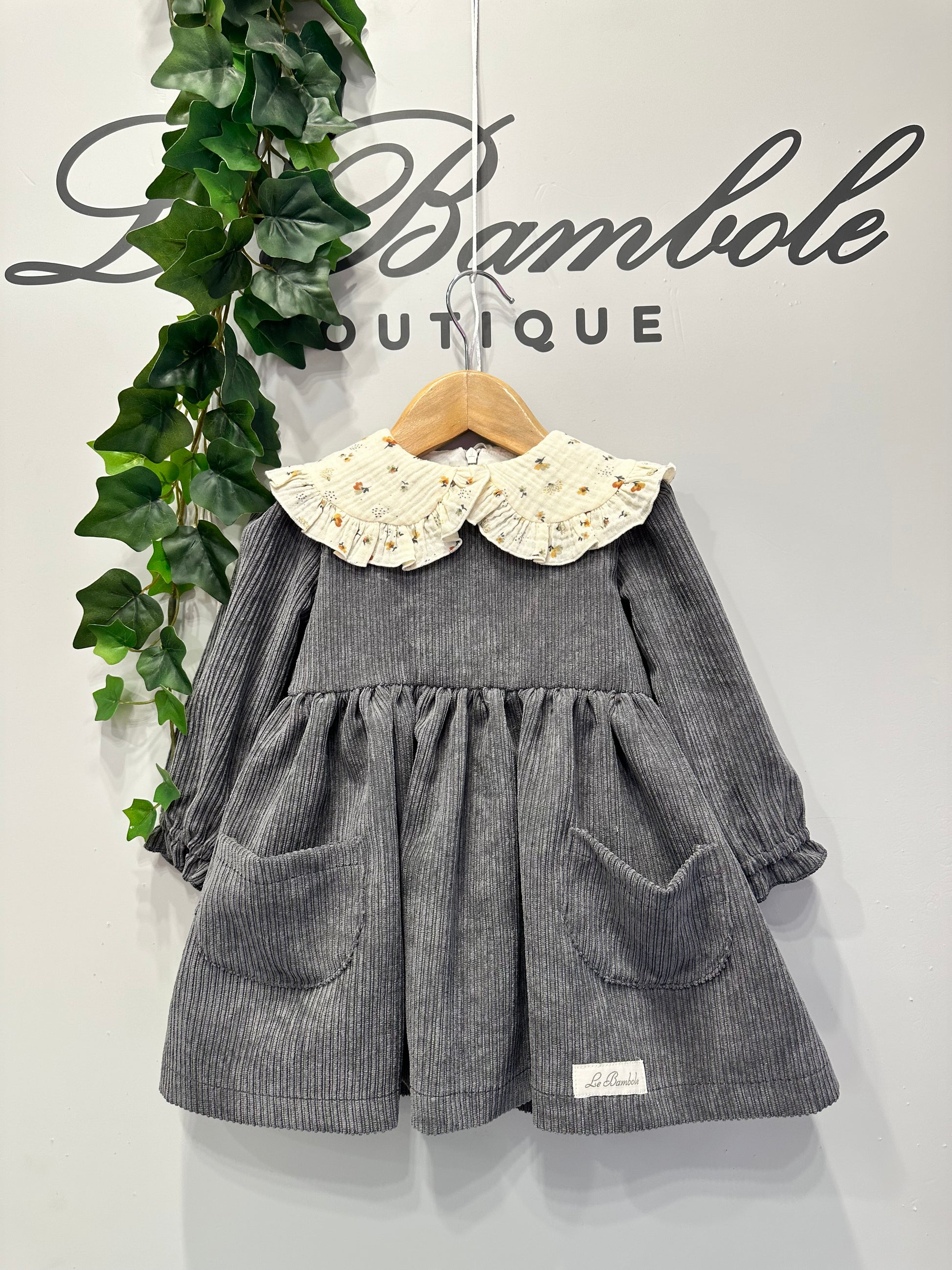 Abito in velluto a coste con tasche e collo in mussola a fantasia.