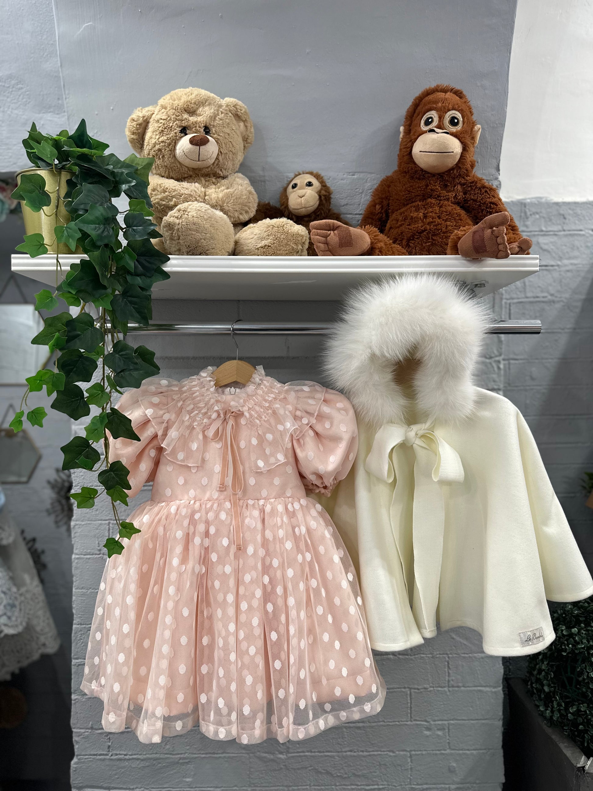 Abito da cerimonia con tulle ricamato a pois e duchesse, con collo Arianna.
