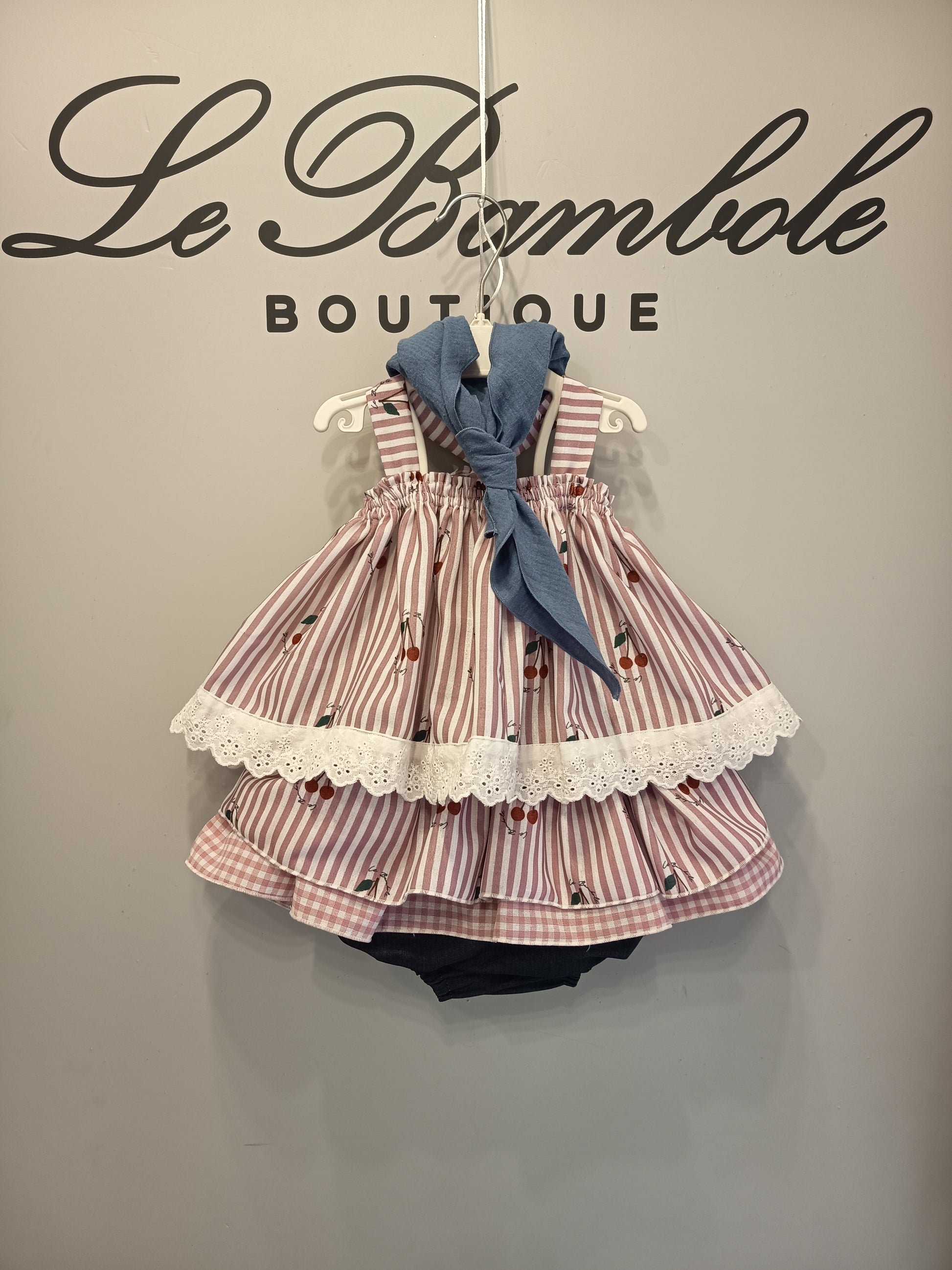 Completo composto da blusa e mutandone in lino fantasie righe e ciliegie tutto logato lebambole