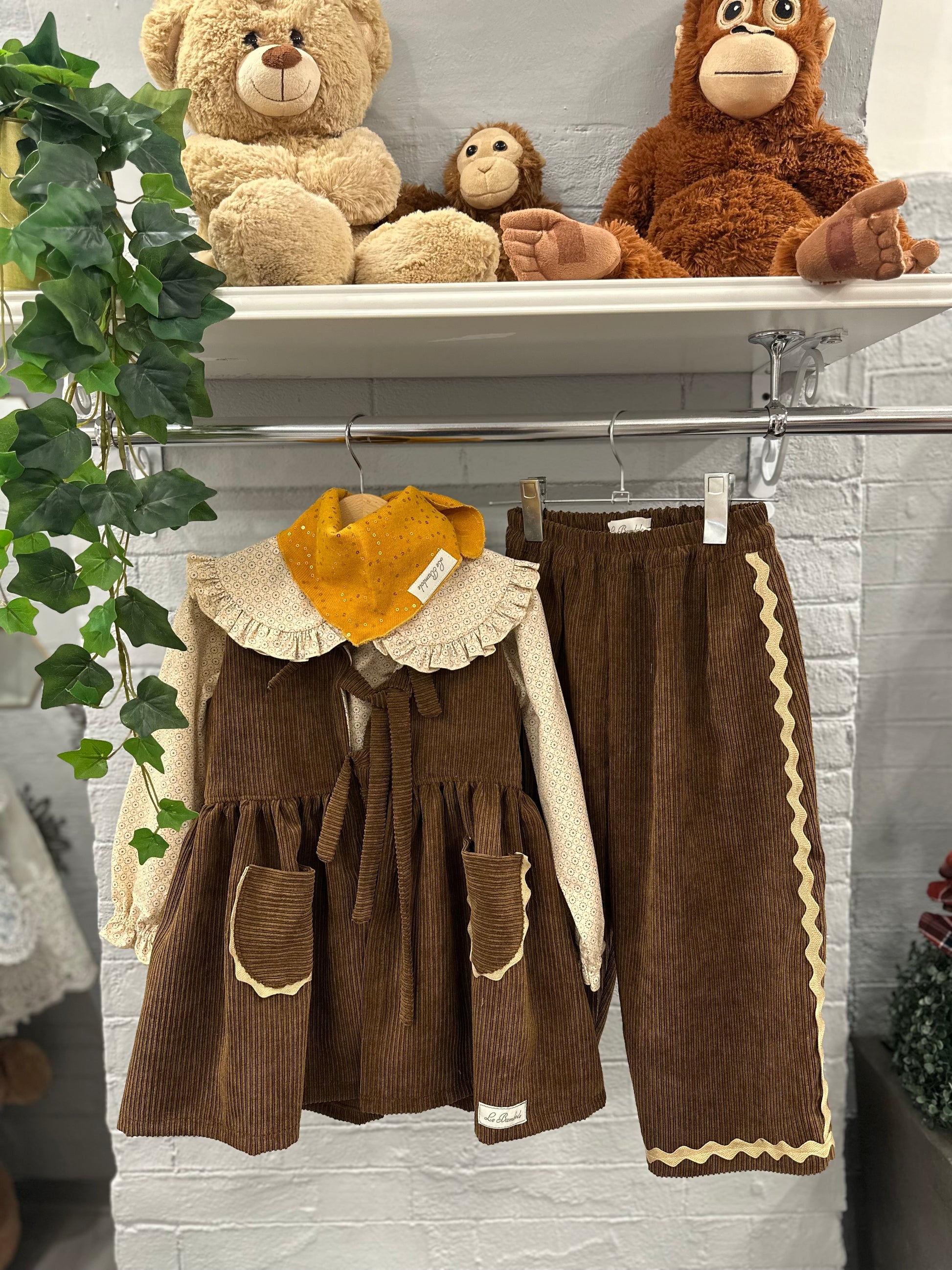 Completo in velluto a coste, composto da gilet e pantalone con serpentina.