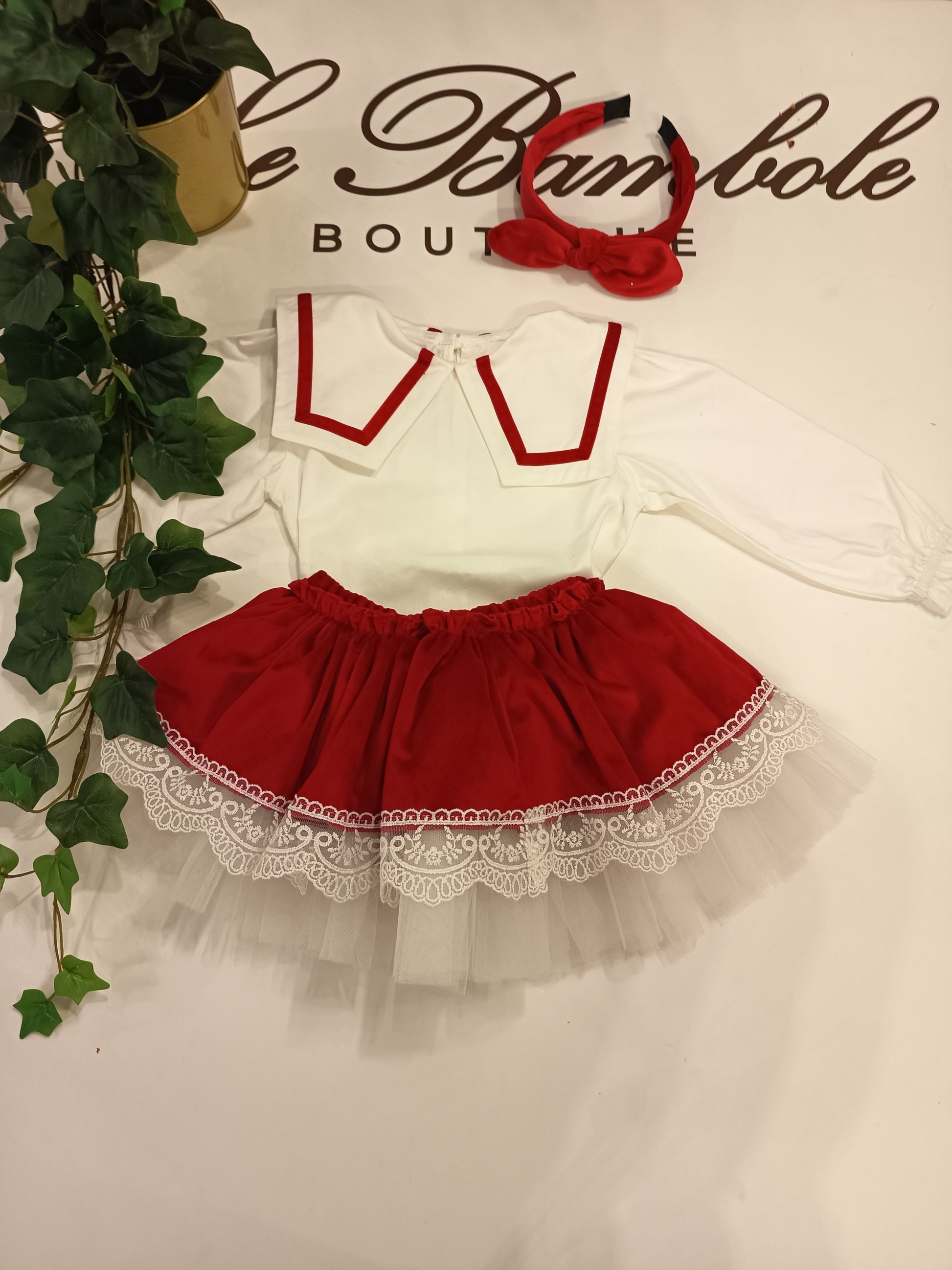 Completo composto da mutandone a doppia balza, composto da tulle e dettagli in pizzo sangallo; camicia in cotone con dettagli in velluto sul colletto.