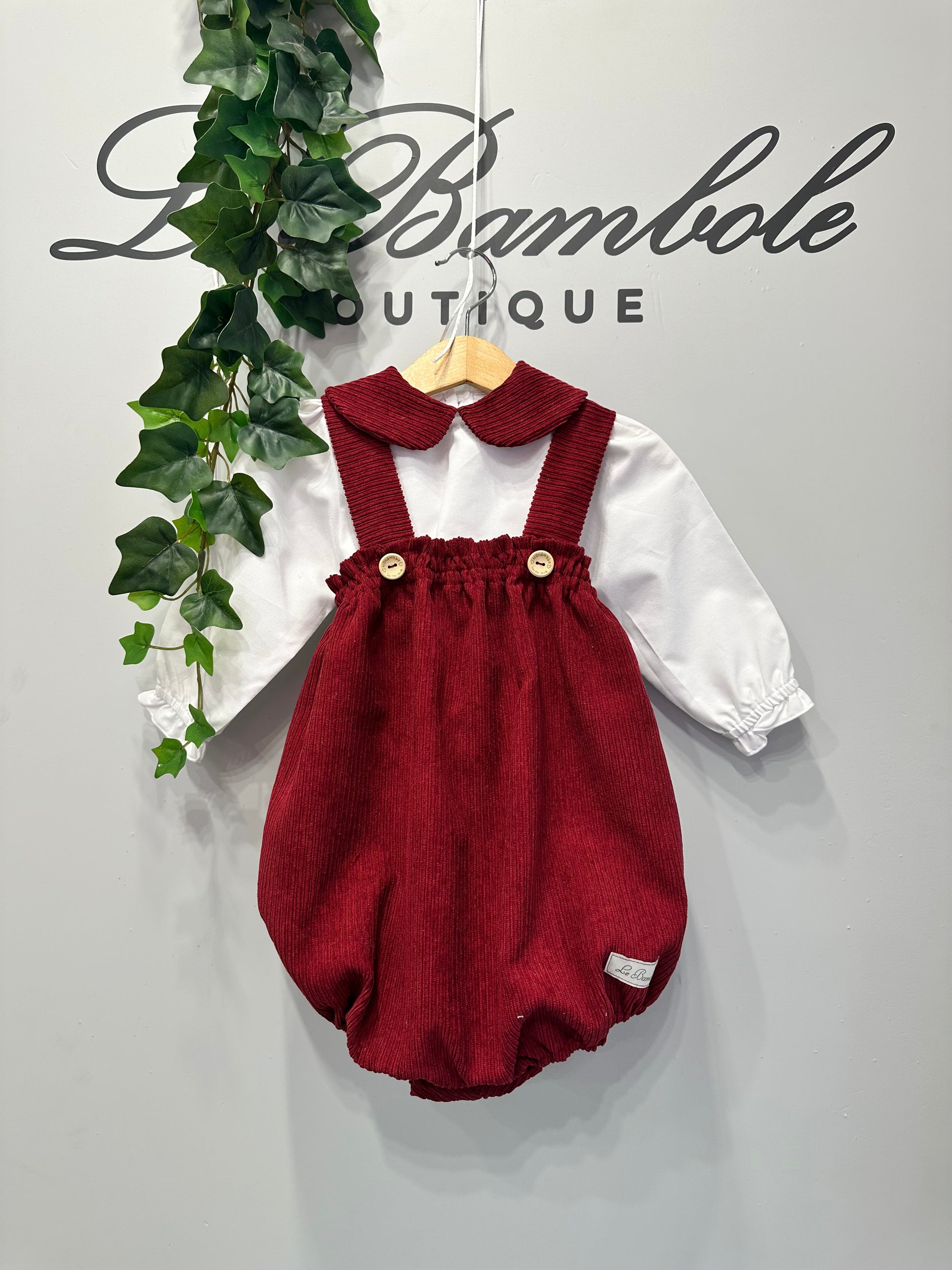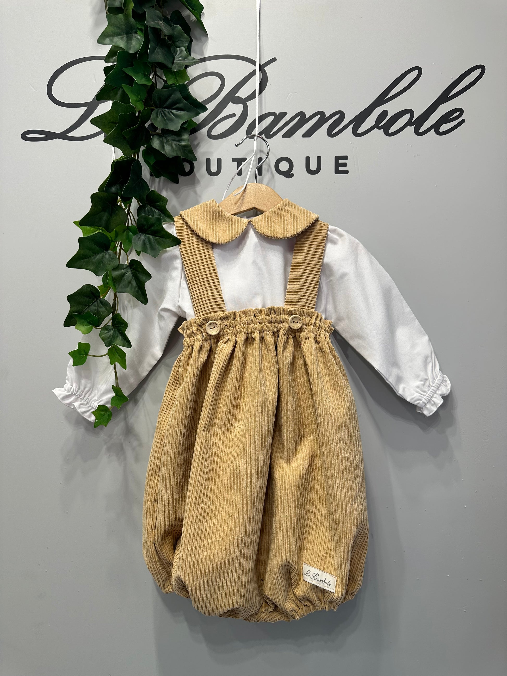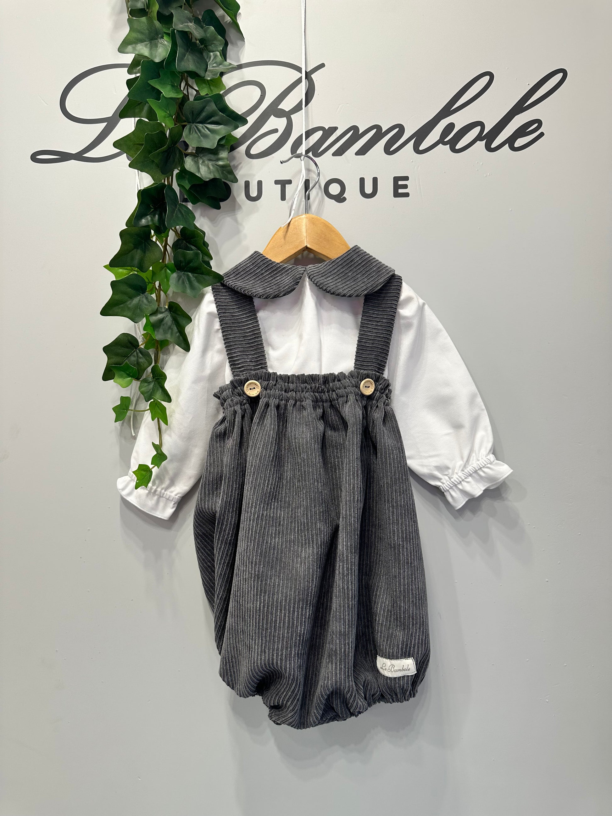 Completo composto da camicia in cotone con collo in velluto e salopette in velluto a coste.