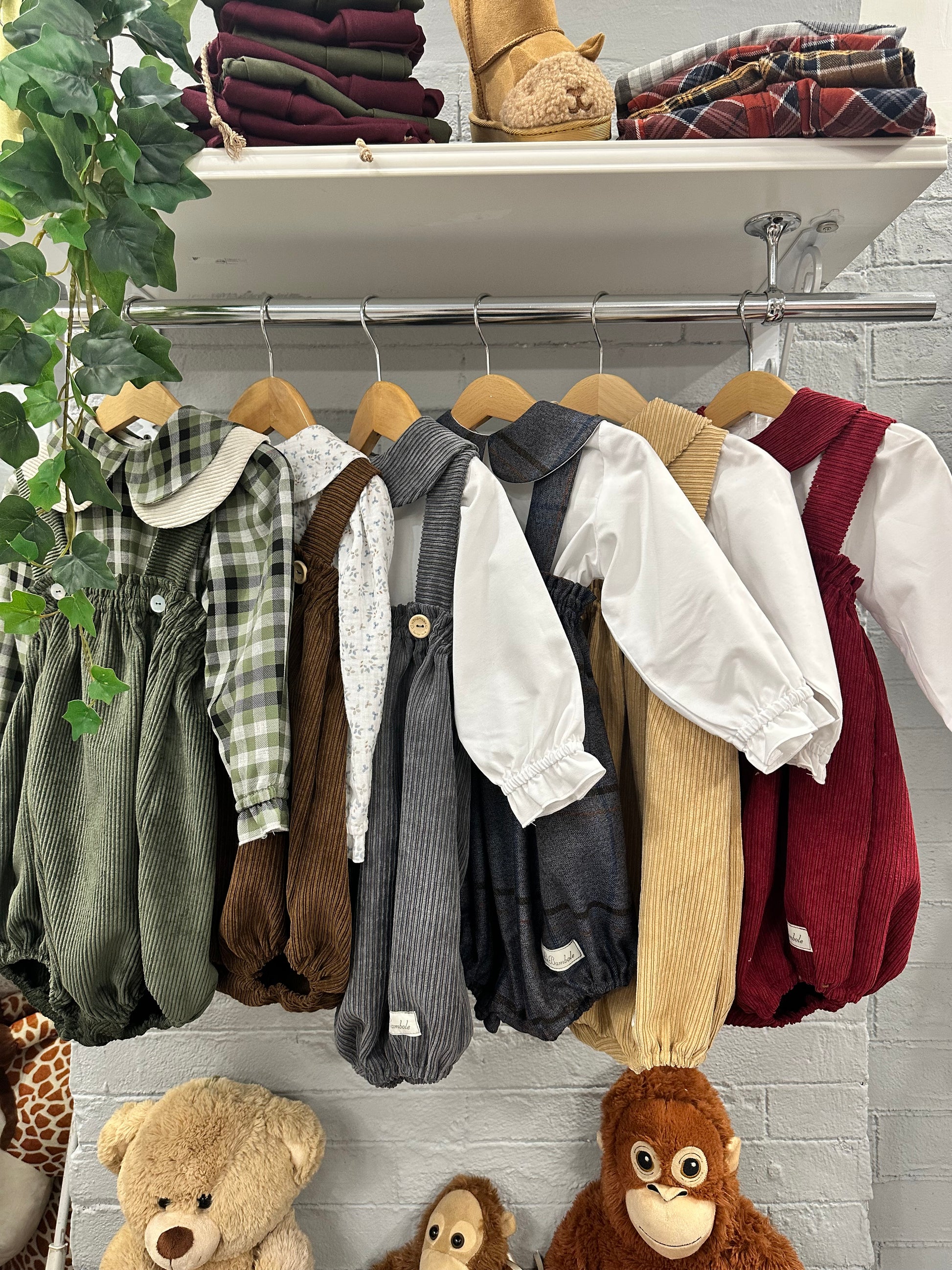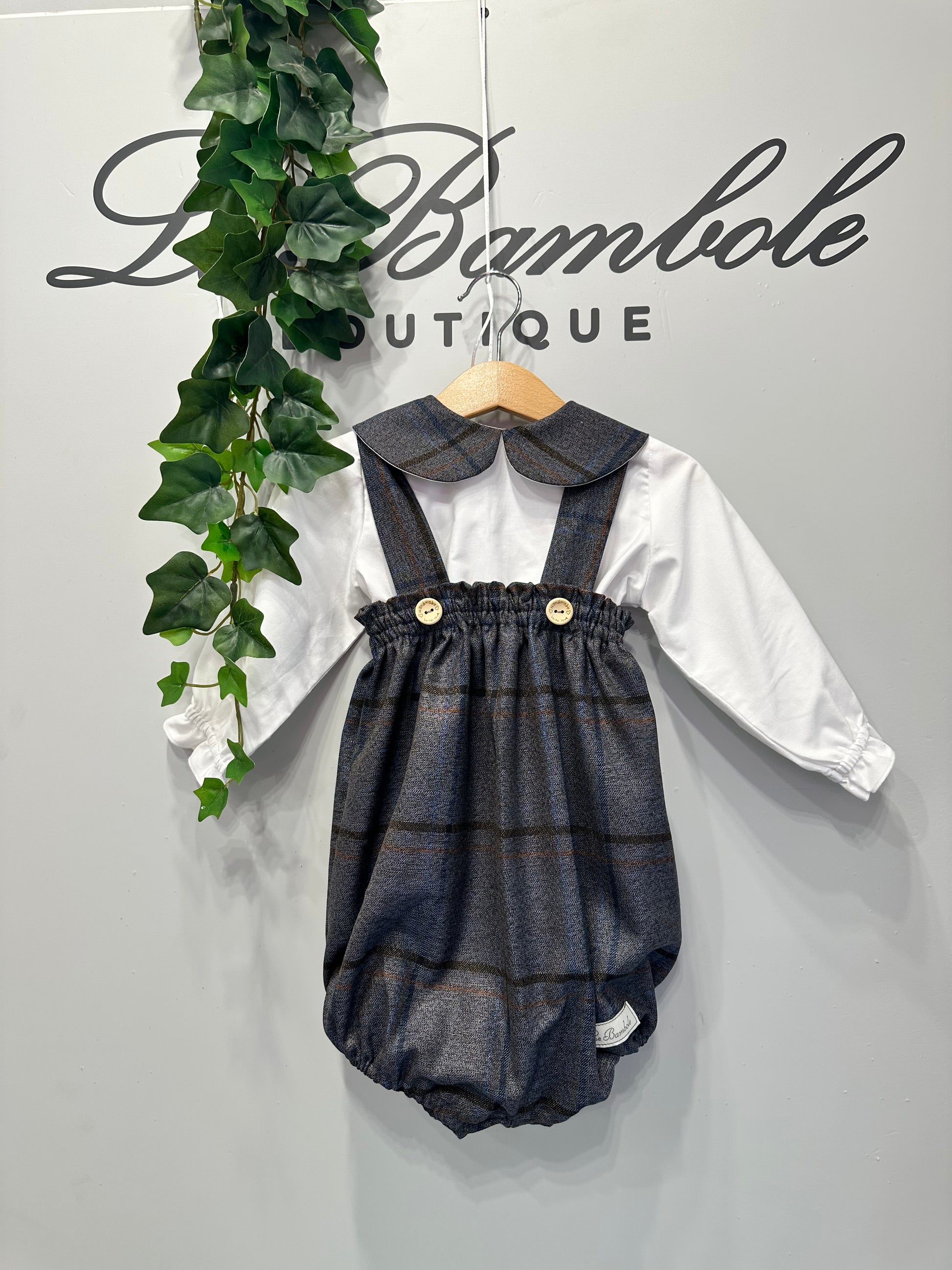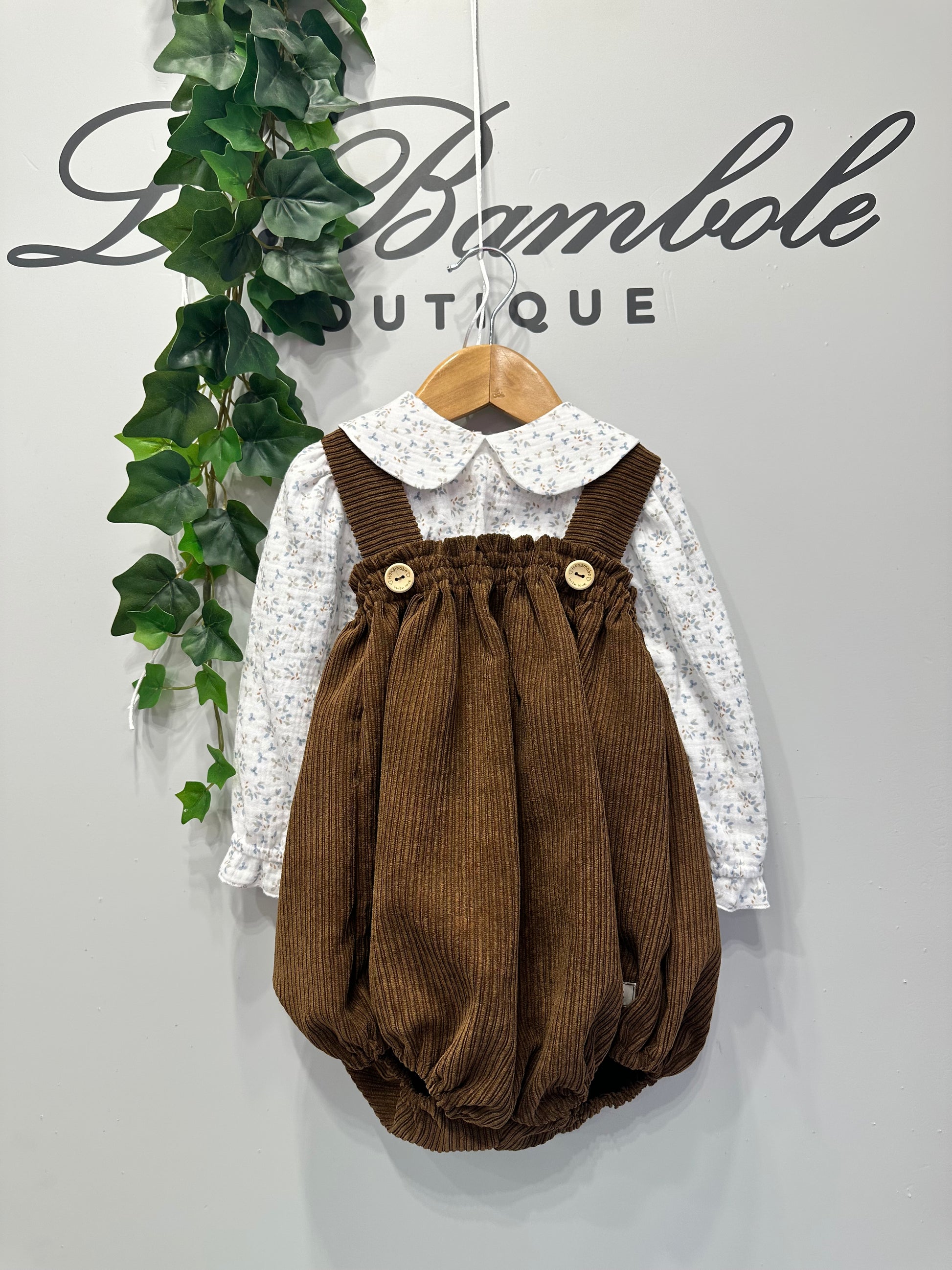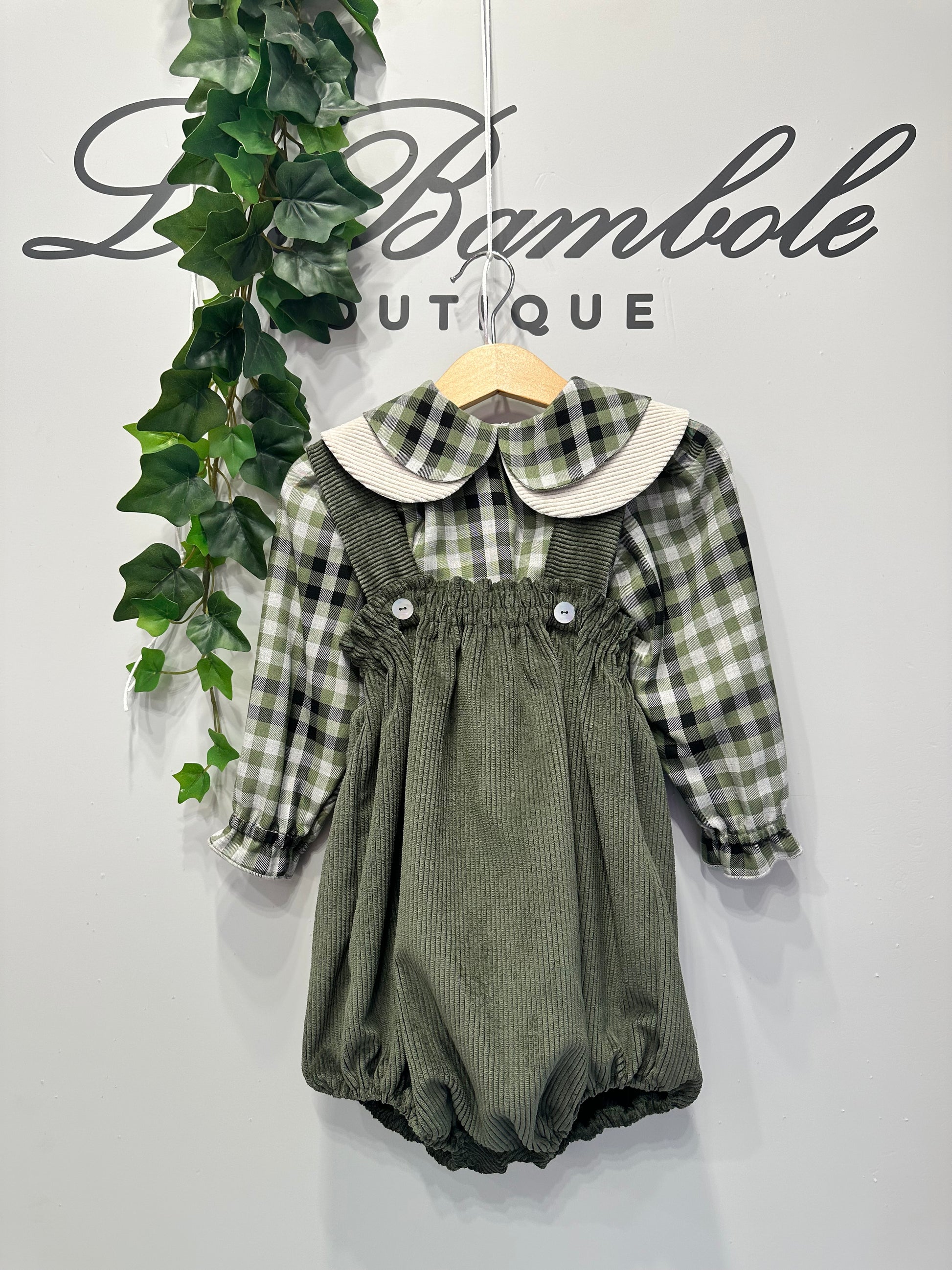 Completo composto da camicia in cotone con collo in velluto e salopette in velluto a coste.