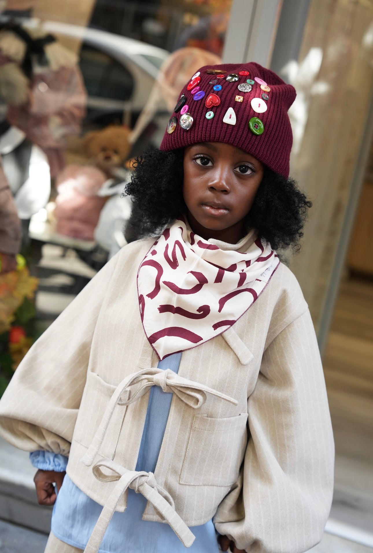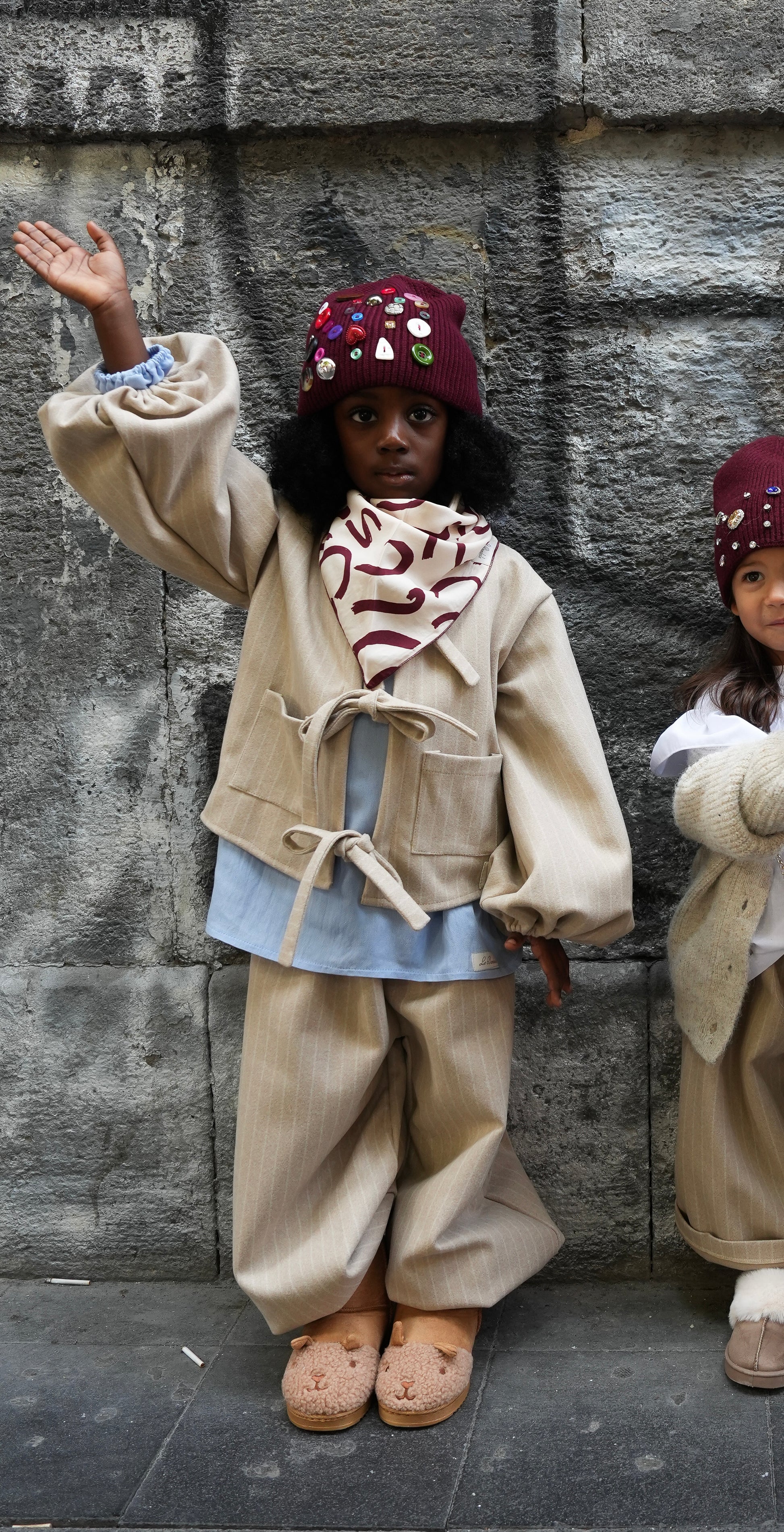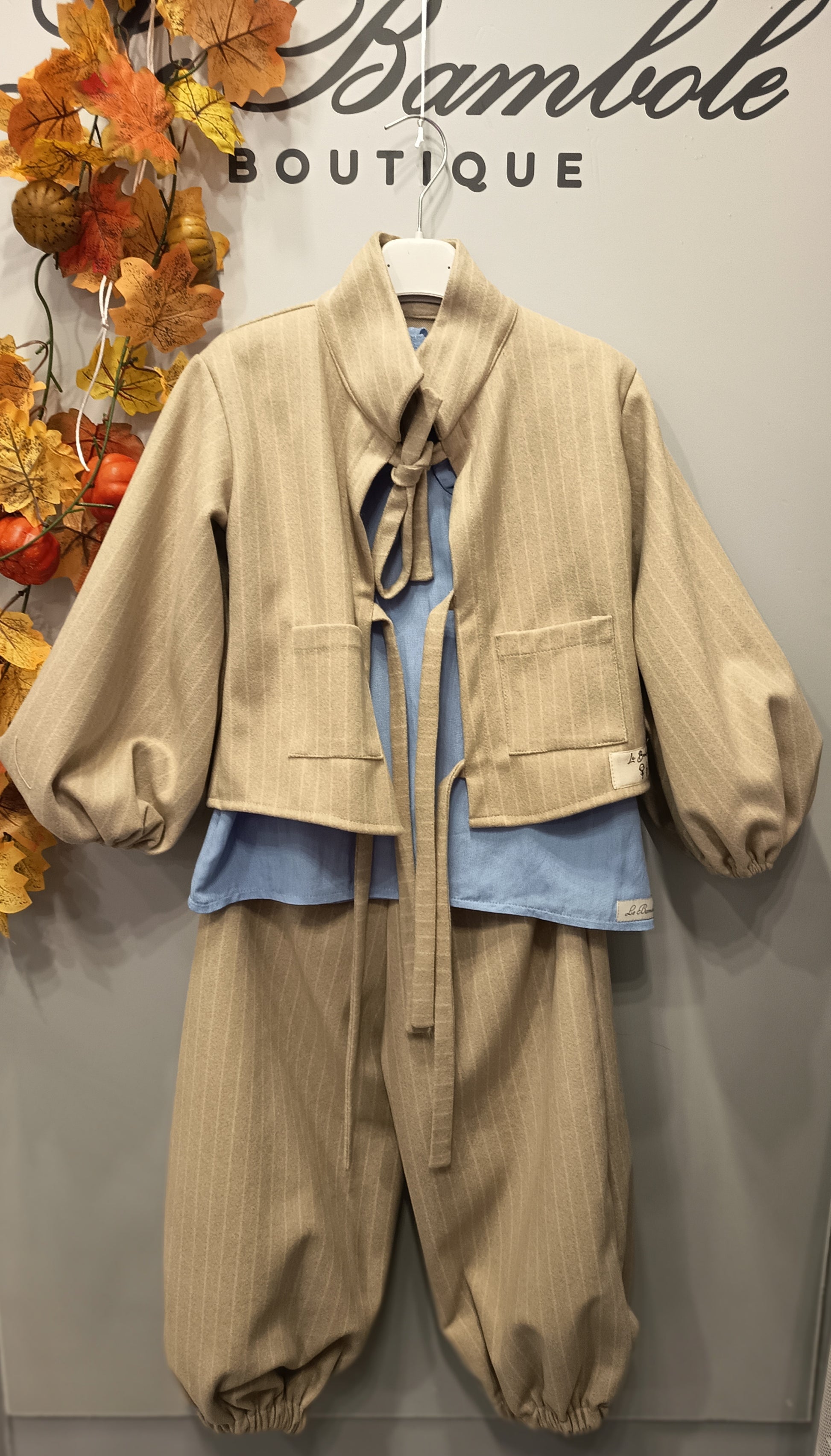 Coordinato composto da camicia in cotone, con effetto punto smock, e pantalone in lana gessato.