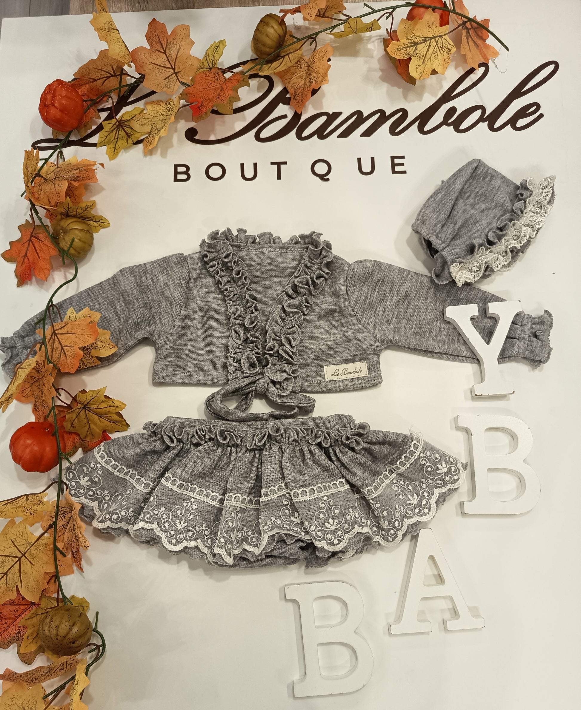 Coordinato in lana co posto da mutandone, golfino e cuffia, con dettagli in pizzo sangallo.
