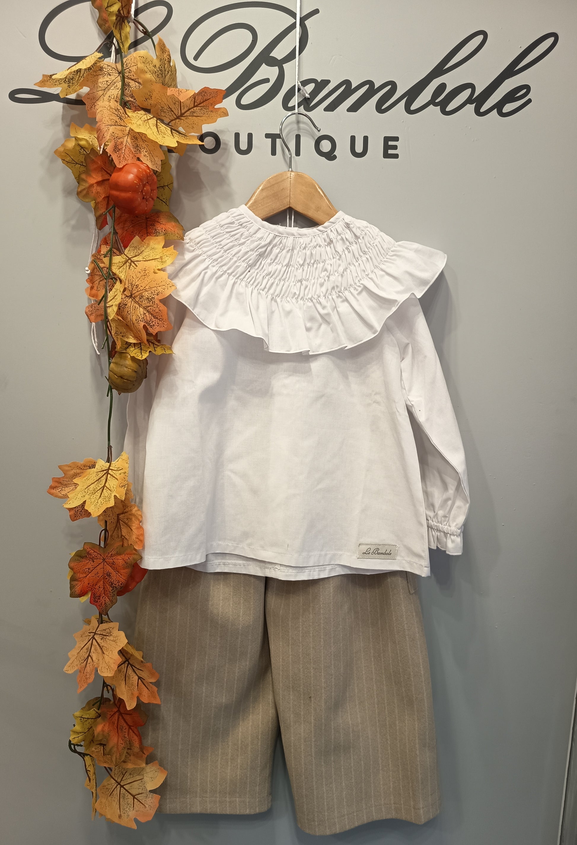 Coordinato composto da camicia in cotone, con effetto punto smock, e pantalone in lana gessato.