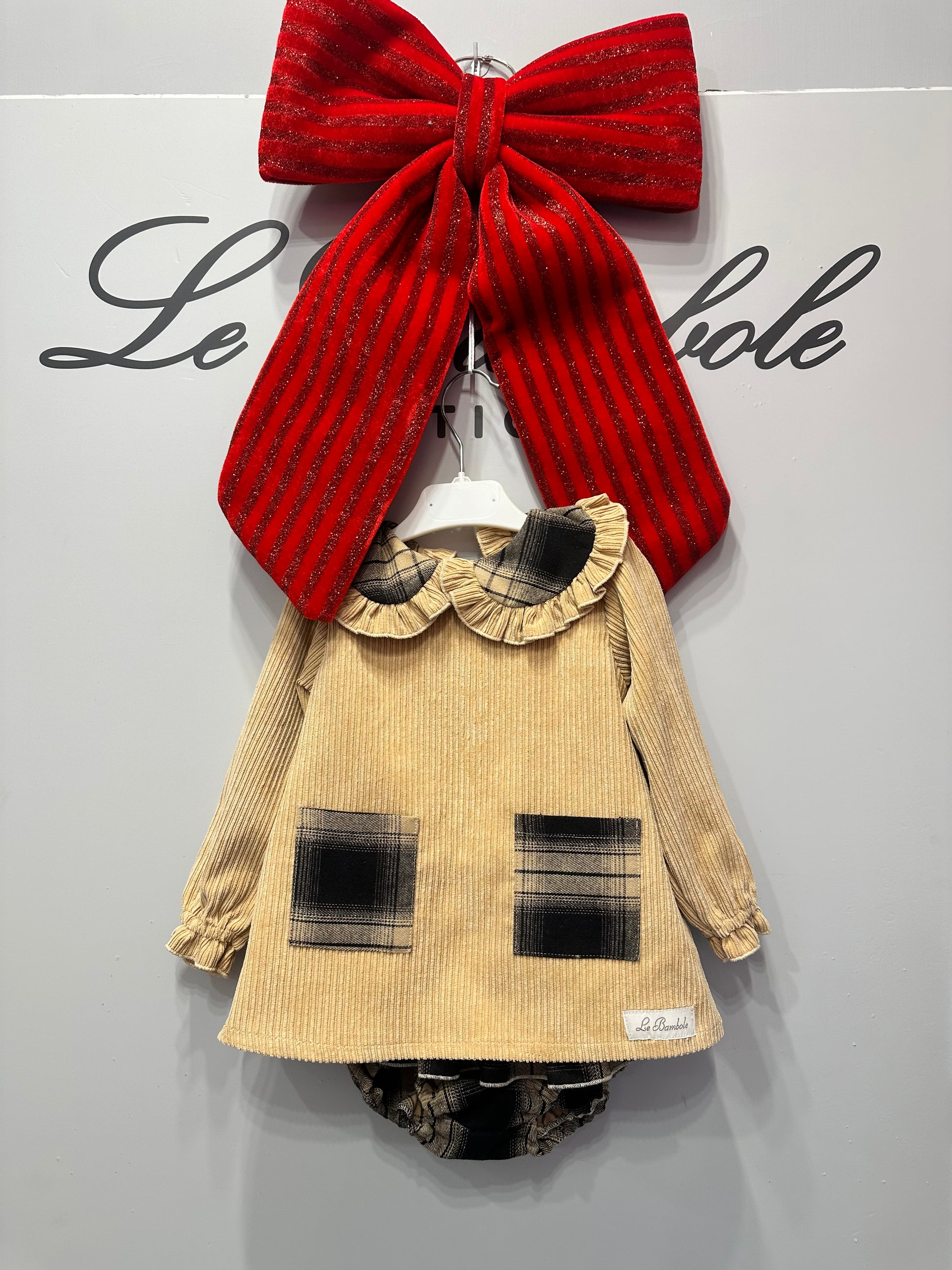 Coordinato composto da camicia e mutandone in velluto a coste, con dettaglio tasca a quadri.