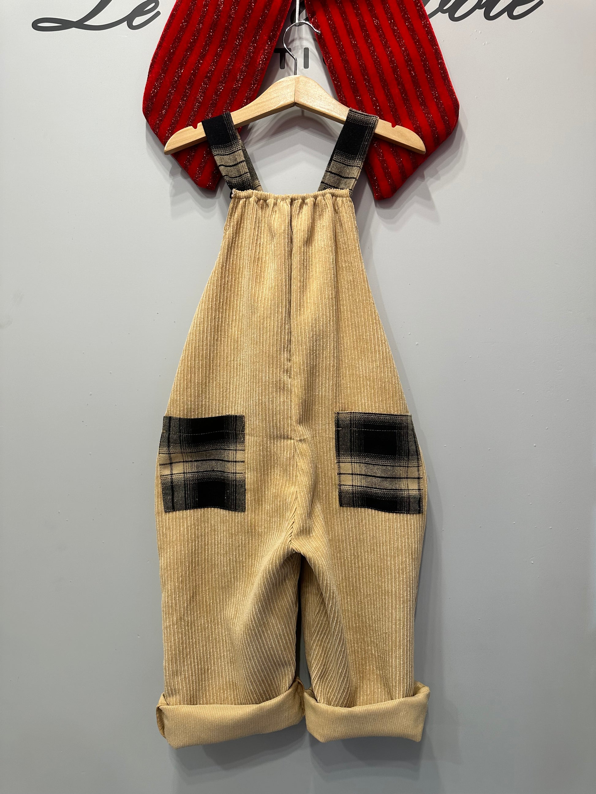 Salopette in velluto a coste, con tasca in lana a quadri.