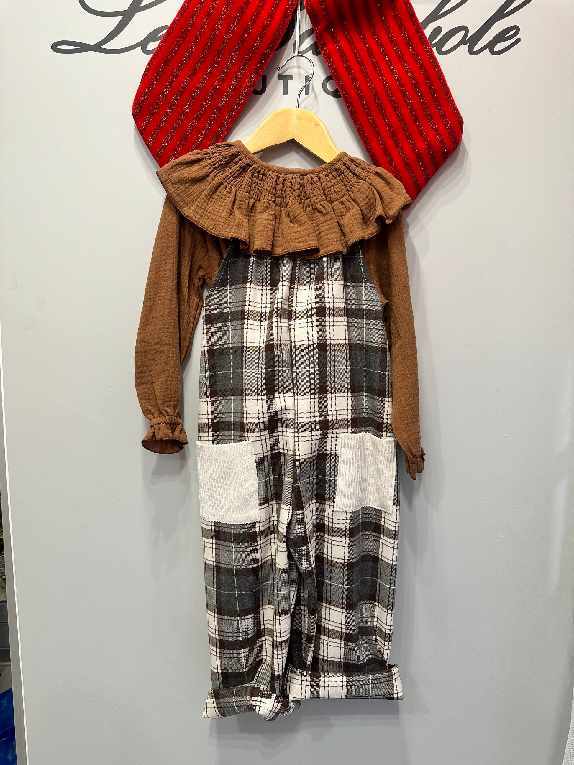Completo composto da camicia in mussola di lana e salopette in lana a quadri, con tasche a contrasto.