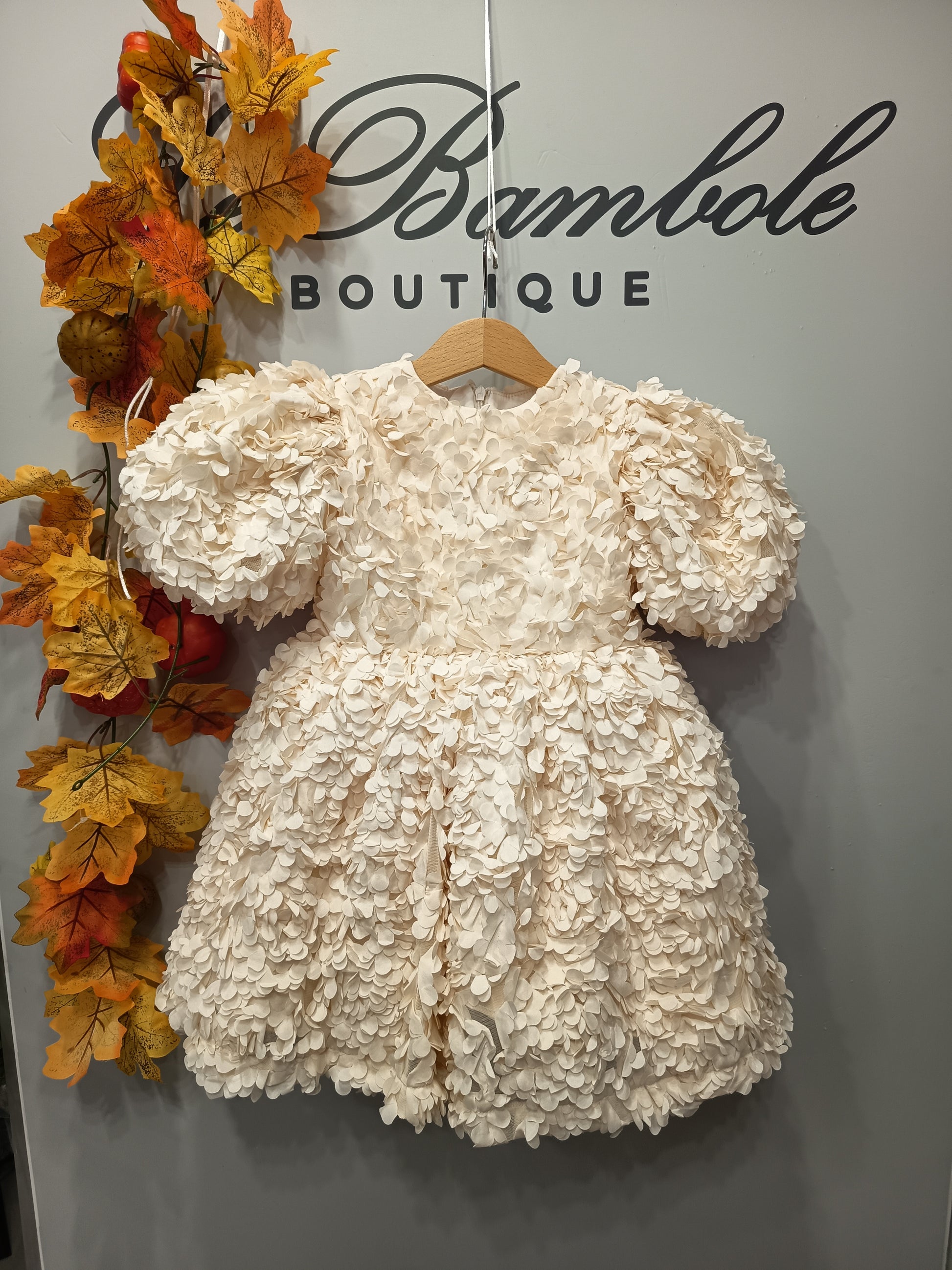 Abito in tulle con rose 3D e manica a sbuffo.