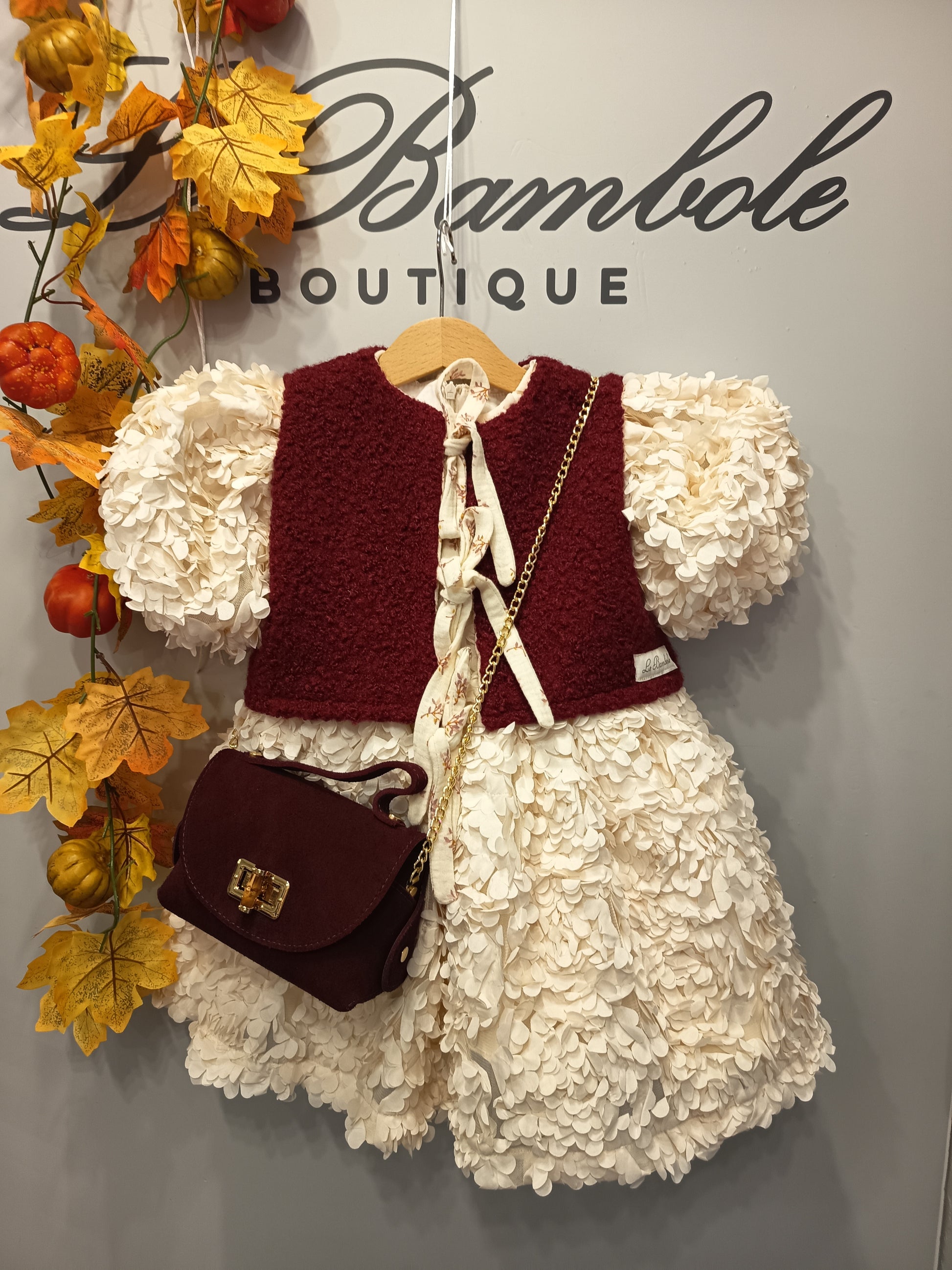 Gilet in lana boucle con chiusure a laccetti regolabili.