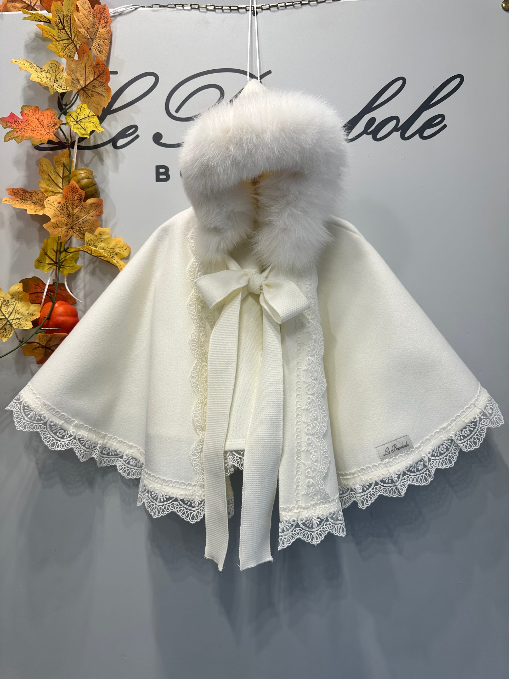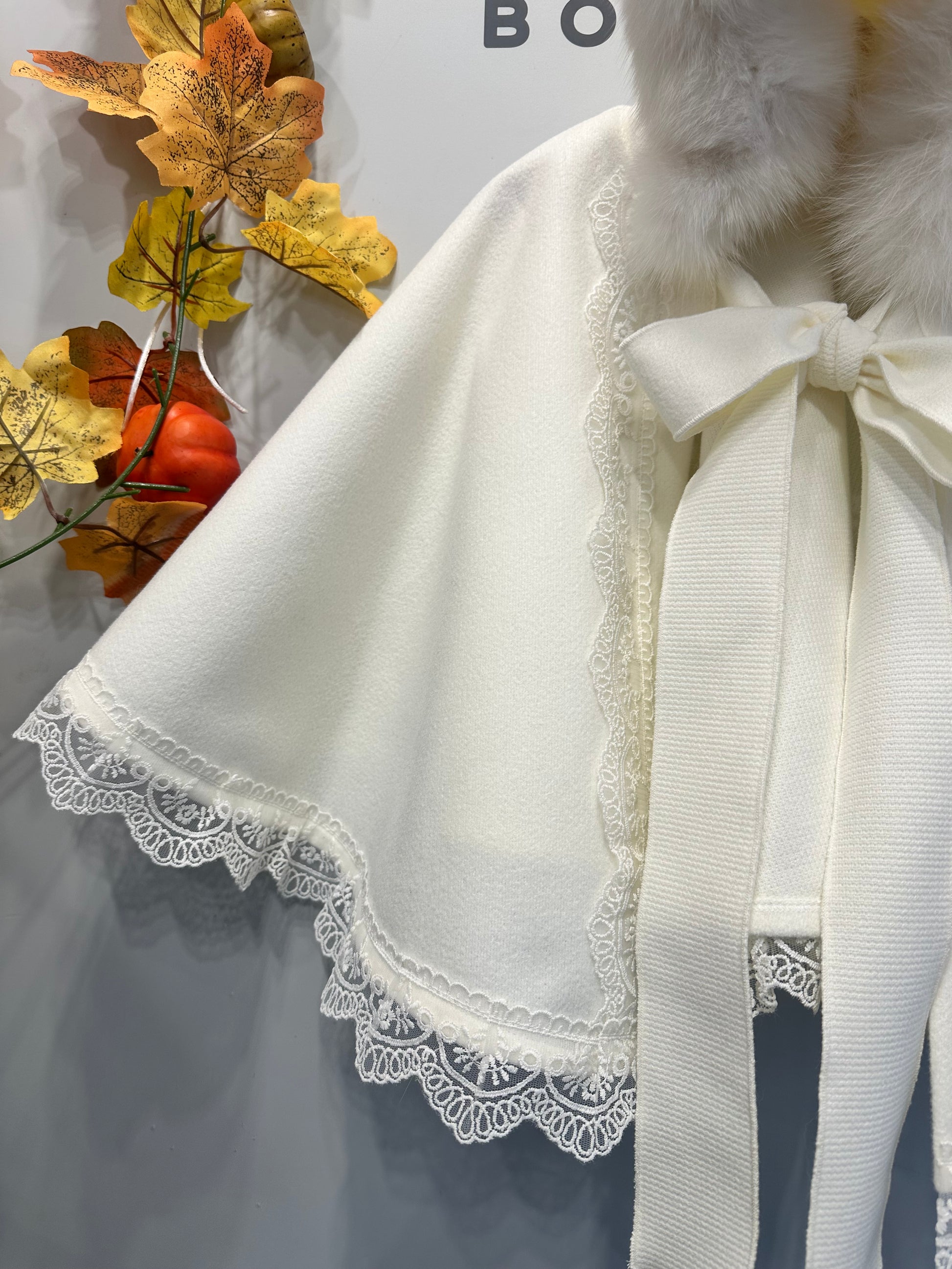 Mantella in lana con collo di pelliccia con chiusura a fiocco. Ricamata con dettagli in pizzo sangallo.