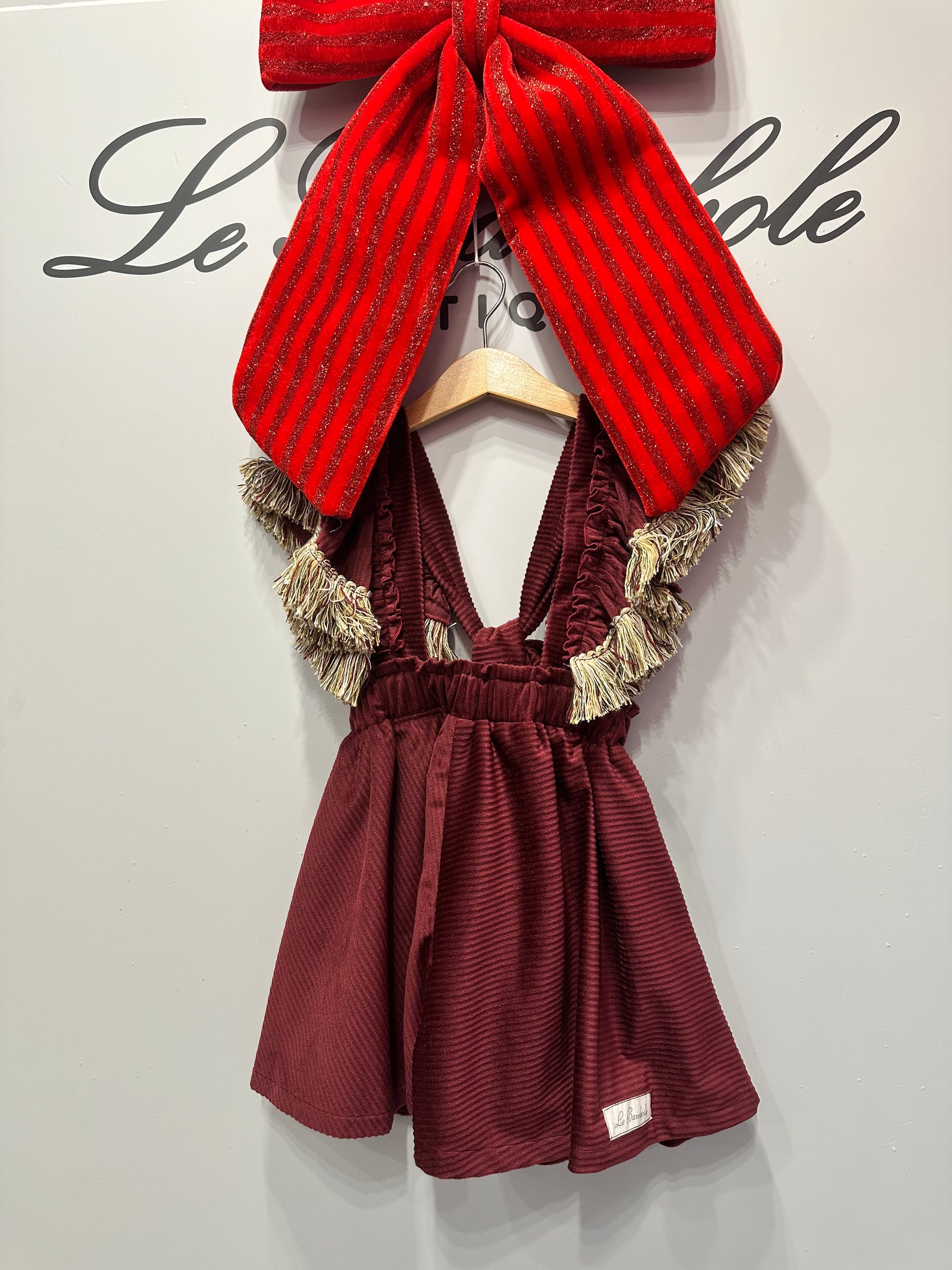 Salopette a farfalla in velluto a coste, con maniche regolabili e dettaglio delle frange.