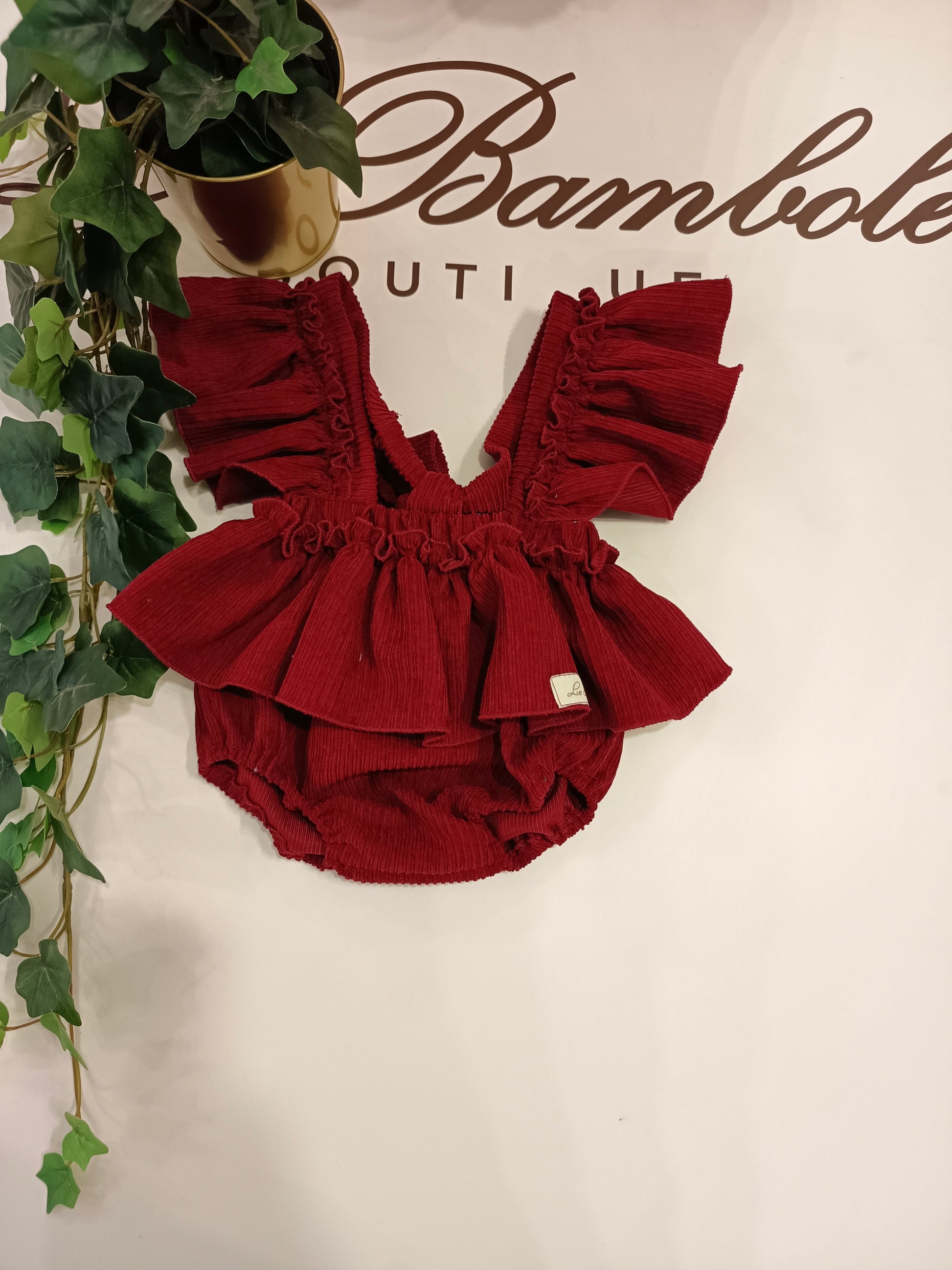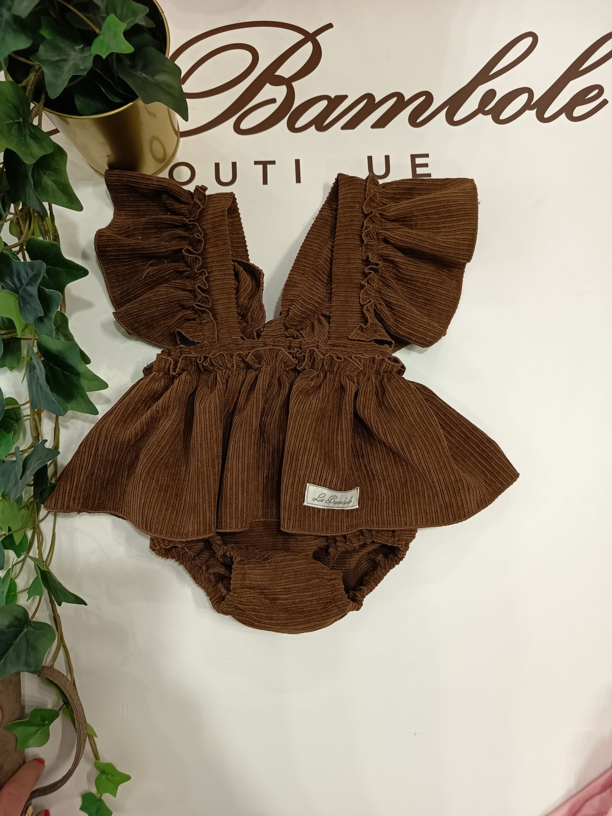 Salopette unica balza in velluto a coste con bretelle a farfalla.