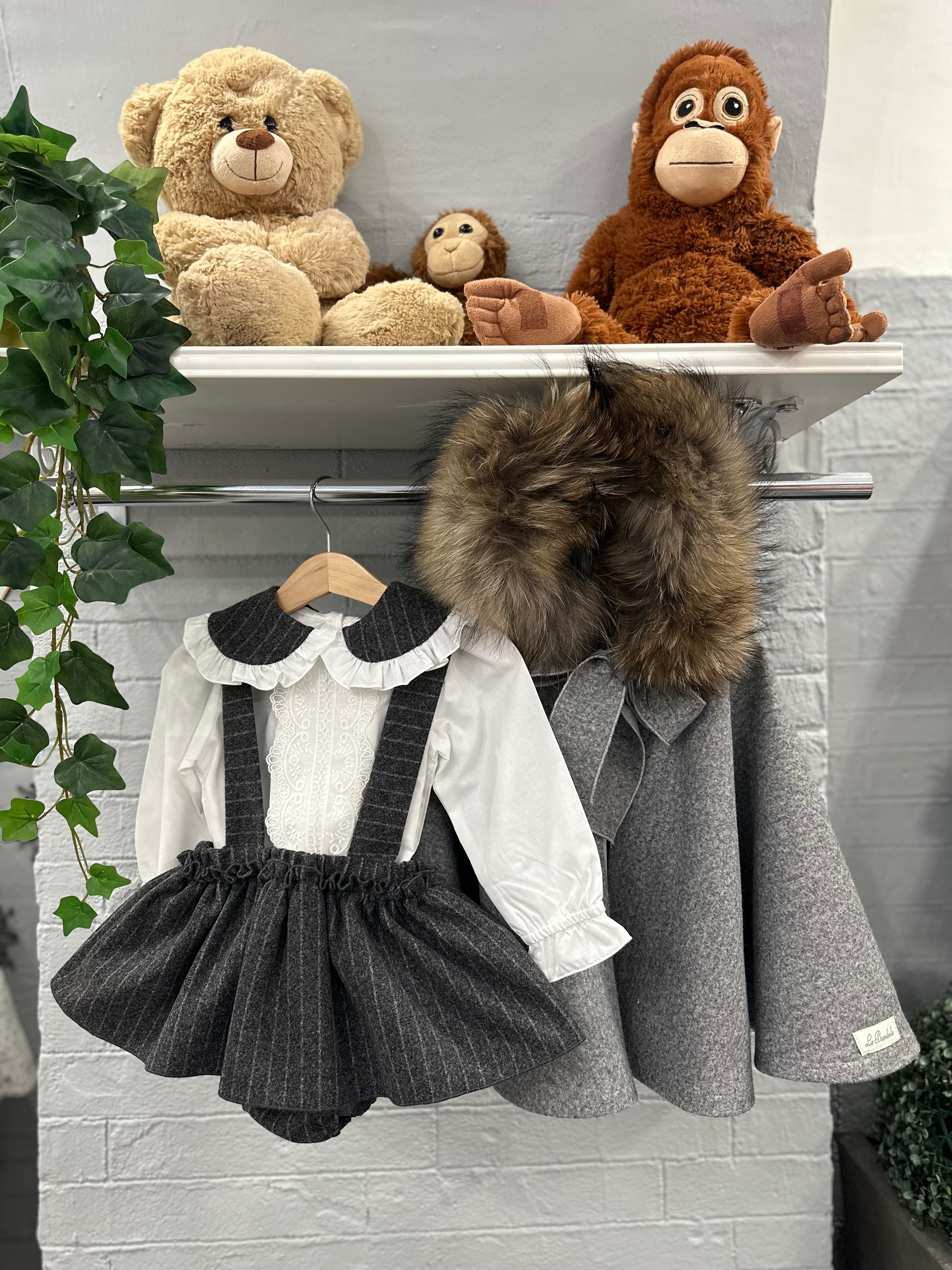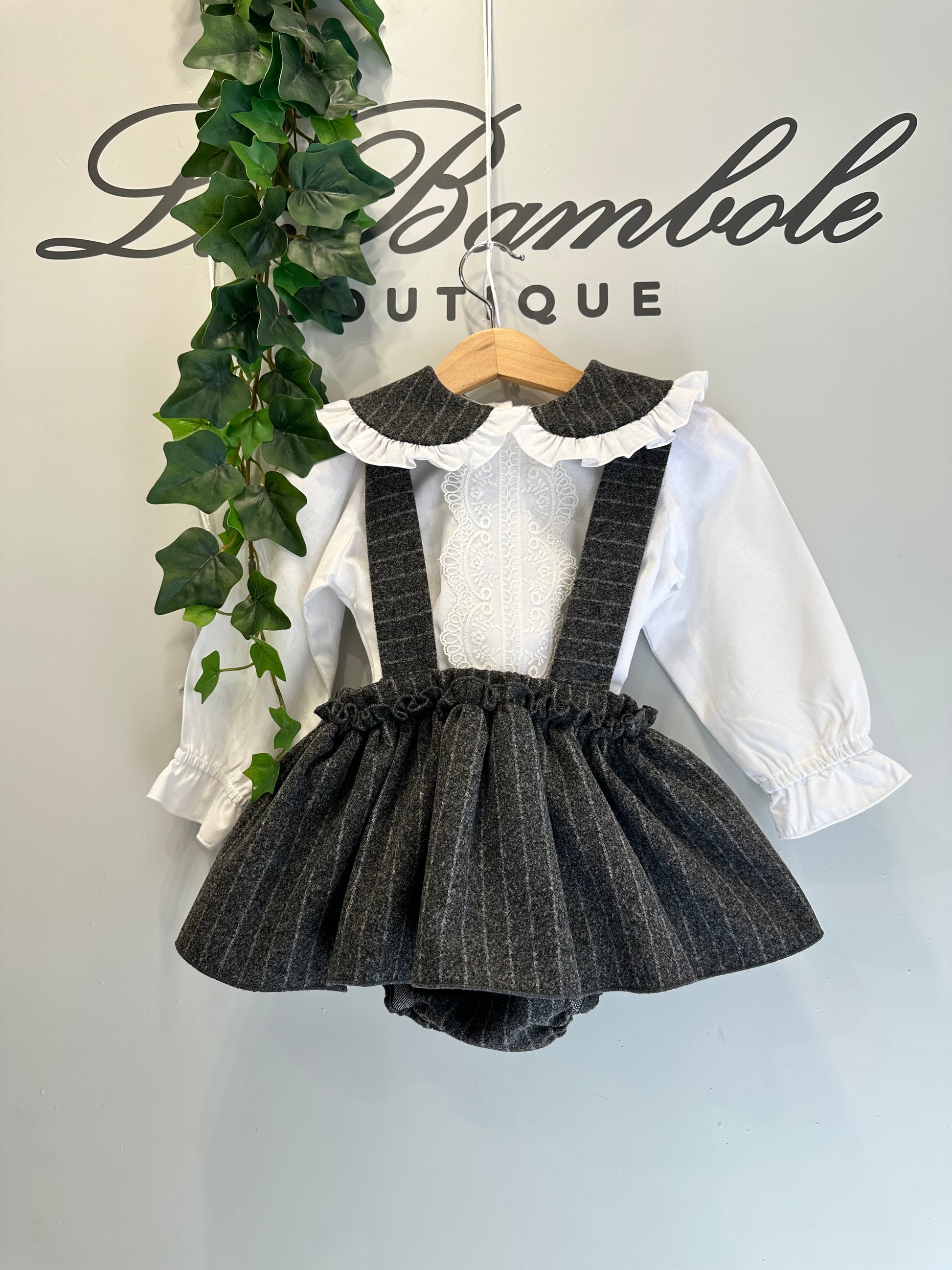 Completo composto da salopette unica balza in lana con bretelle semplici, camicia in mussola con collo abbinato e dettaglio in pizzo.