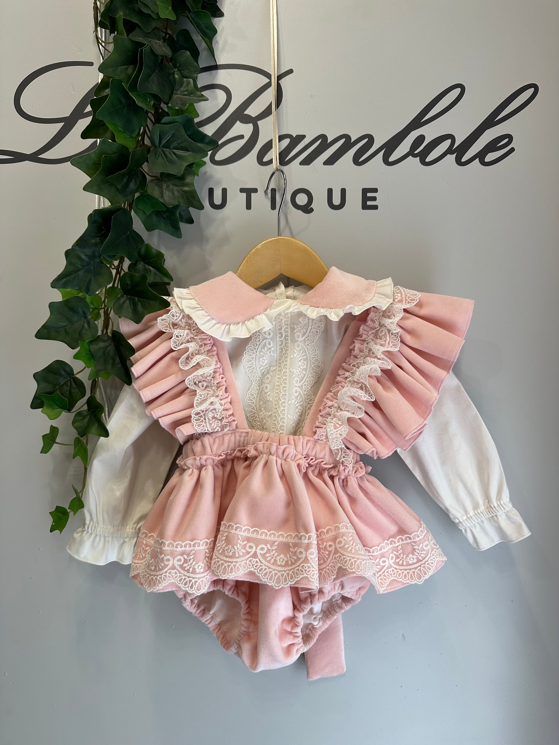 Completo composto da salopette unica balza in velluto con bretelle a farfalla e camicia con collo abbinato.