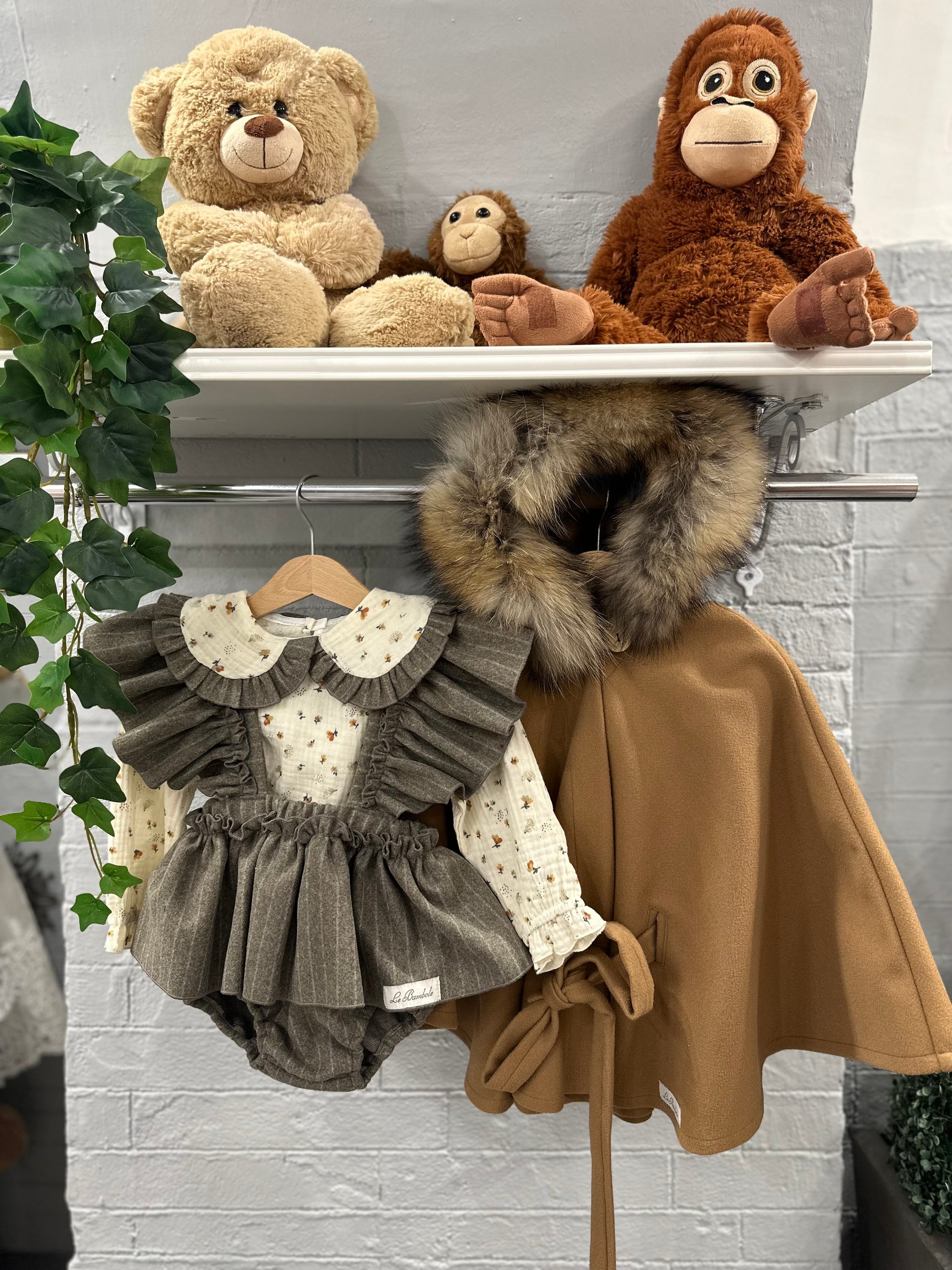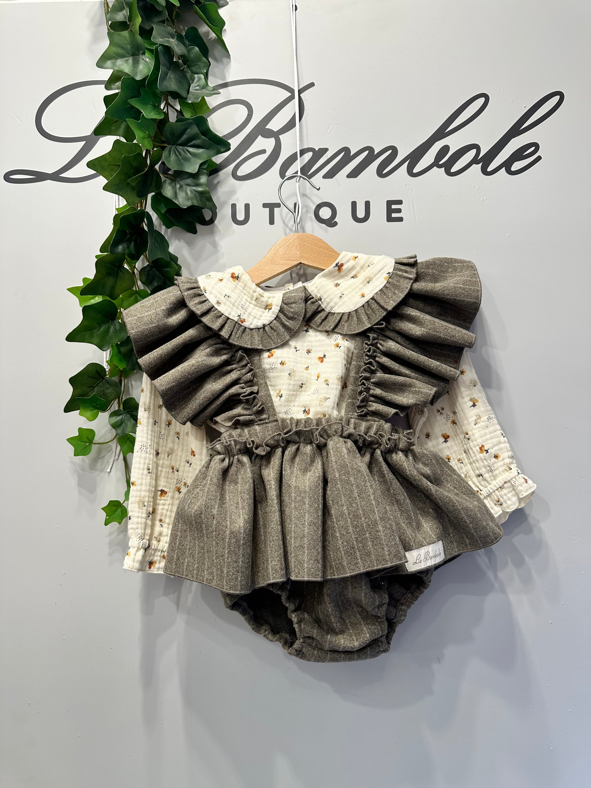 Completo composto da salopette unica balza in lana con bretelle a farfalla, camicia in mussola con collo abbinato.