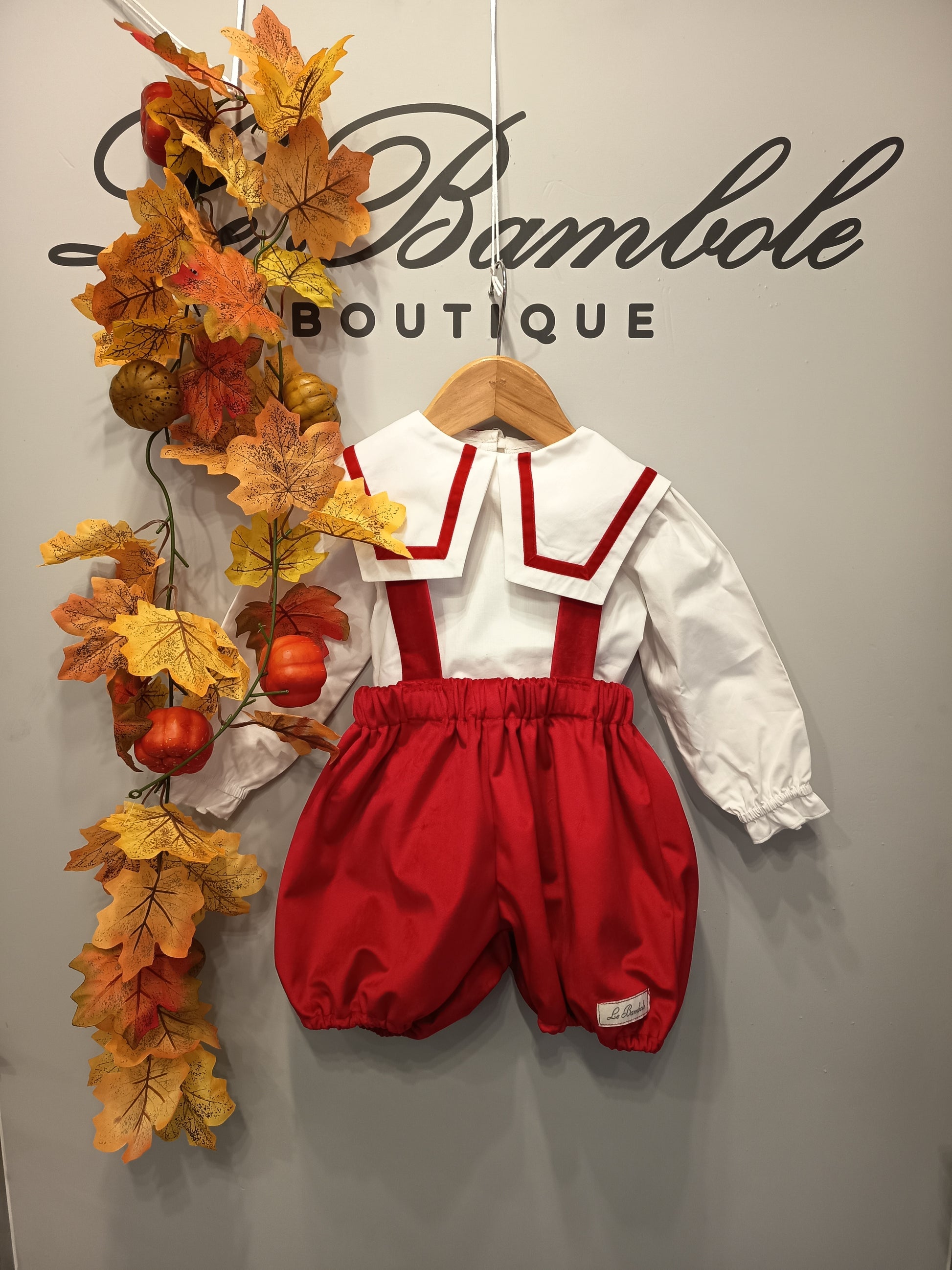 Completo composto da pantaloncino con bretelle in velluto, e camicia in cotone con dettagli in velluto rosso.